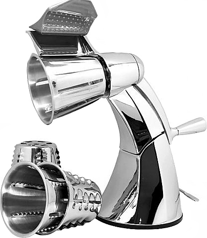 В комплект поставки входят 5 насадок: шредер, мелкая и крупная ломтерезки, терка для картофеля фри и вафельная насадка.