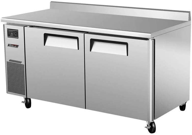 Холодильный стол Turbo air KWR15-2 предназначен для раскатки теста, обработки, охлаждения и кратковременного хранения продуктов и напитков на предприятиях общественного питания и торговли. Корпус выполнен из нержавеющей стали (гальванизированная сталь на оборотной стороне и внизу) с применением пожаробезопасных стенок толщиной 60 мм, уплотнения - из АБС-пластика (акрилонитрилбутадиенстирола), не пропускающего конденсата, пол - из нержавеющей стали с алюминиевыми вставками по бокам и сзади оборудования, регулируемые полки - из толстой стальной проволоки с виниловым покрытием.