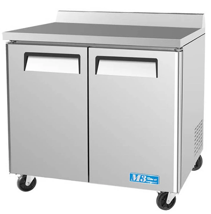 Холодильный стол Turbo air CMWR-36 используется на предприятиях общественного питания, торговли и пищевых производствах для обработки, охлаждения и кратковременного хранения продуктов, а также для раскатки теста. Стол оснащен динамической системой охлаждения, аналоговым управлением и установлен на 4 колеса (2 фронтальные со стопорами). Материал корпуса - нержавеющая сталь, материал задней стенки и пола - гальванизированная сталь, материал пола - нержавеющая сталь с алюминиевыми вставками, материал регулируемых полок - толстая стальная проволока с виниловым покрытием.