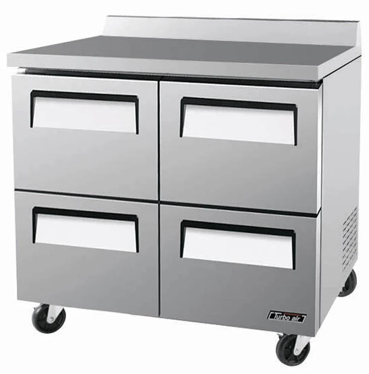 Холодильный стол Turbo air CMWR-36-2D-4 используется на предприятиях общественного питания, торговли и пищевых производствах для обработки, охлаждения и кратковременного хранения продуктов, а также для раскатки теста. Стол оснащен динамической системой охлаждения, аналоговым управлением и установлен на 4 колеса (2 фронтальные со стопорами). Материал корпуса и направляющих - нержавеющая сталь, материал задней стенки и пола - гальванизированная сталь, материал пола - нержавеющая сталь с алюминиевыми вставками, материал регулируемых полок - толстая стальная проволока с виниловым покрытием.