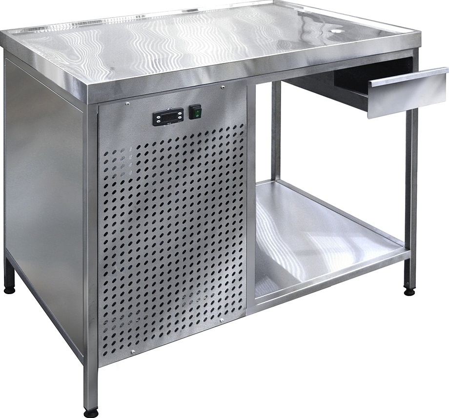 Холодильный стол Finist СХСо-1300-700 используется на предприятиях общественного питания, торговли и пищевых производствах для хранения и обработки полуфабрикатов из мяса и рыбы, заготовок для салата, охлажденных напитков и прочих пищевых продуктов. Управление при помощи кнопочной панели управления, оснащенной цифровым дисплеем. Охлаждаемая рабочая поверхность, выдвижной ящик-лоток, открытая полка для хранения продукции и инвентаря. Холодильный агрегат располагается сбоку. Стол установлен на ножки с подпятниками. Материал корпуса - нержавеющая сталь.