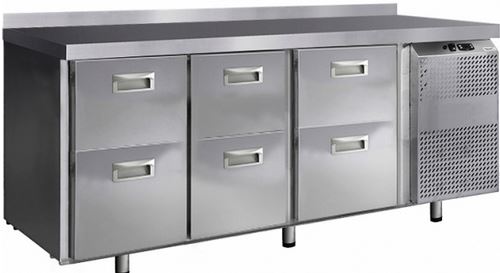 Холодильный стол Finist СХС-700-0/6 используется на предприятиях общественного питания, торговли и пищевых производствах для хранения и обработки полуфабрикатов из мяса и рыбы, заготовок для салата, охлажденных напитков и прочих пищевых продуктов. Управление при помощи кнопочной панели управления, оснащенной цифровым дисплеем. 6 выдвижных ящиков, агрегатный отсек располагается сбоку. Стол установлен на ножки с подпятниками. Материал корпуса - нержавеющая сталь.