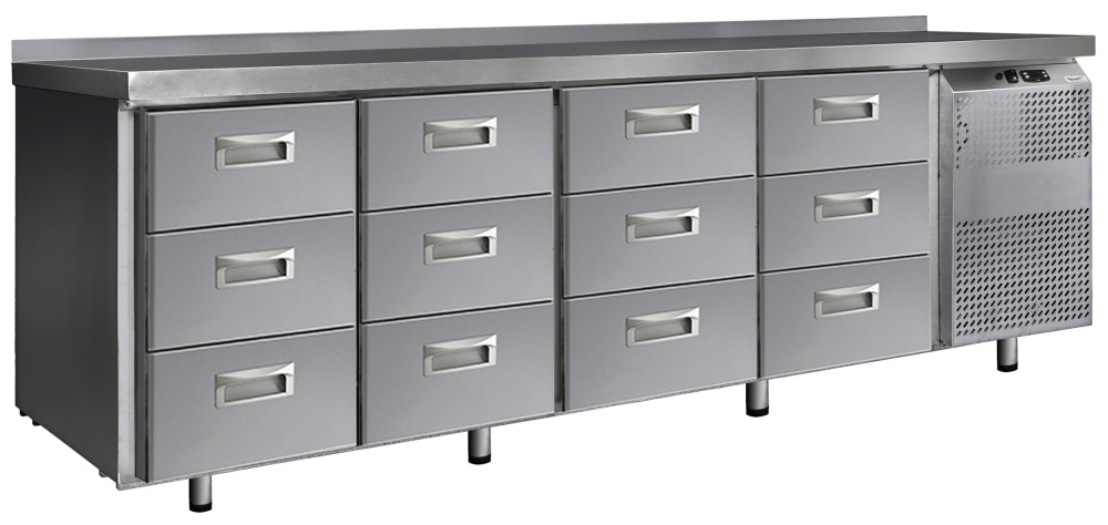 Холодильный стол Finist СХС-700-0/12 используется на предприятиях общественного питания, торговли и пищевых производствах для хранения и обработки полуфабрикатов из мяса и рыбы, заготовок для салата, охлажденных напитков и прочих пищевых продуктов. Управление при помощи кнопочной панели управления, оснащенной цифровым дисплеем. 12 выдвижных ящиков, агрегатный отсек располагается сбоку. Стол установлен на ножки с подпятниками. Материал корпуса - нержавеющая сталь.