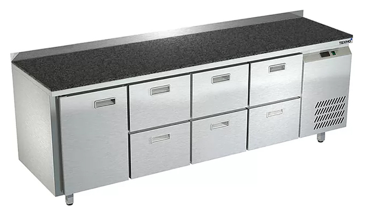 Холодильный стол Техно-ТТ СПБ/О-422/16-2207 предназначается для раскатки теста, обработки, охлаждения и кратковременного хранения продуктов и напитков на предприятиях общественного питания, торговли и пищевых производствах. Секции оснащены направляющими и ящиками с доводчиками. Материал корпуса - нержавеющая сталь AISI 430, материал столешницы - гранит (толщина 20 мм), материал задней панели и дна - оцинкованная сталь.