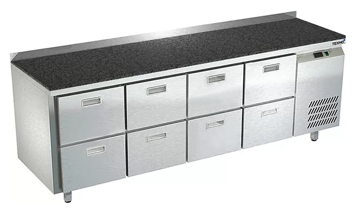 Холодильный стол Техно-ТТ СПБ/О-423/08-2206 предназначается для раскатки теста, обработки, охлаждения и кратковременного хранения продуктов и напитков на предприятиях общественного питания, торговли и пищевых производствах. Секции оснащены направляющими и ящиками с доводчиками. Материал корпуса - нержавеющая сталь AISI 430, материал столешницы - гранит (толщина 20 мм), материал задней панели и дна - оцинкованная сталь.
