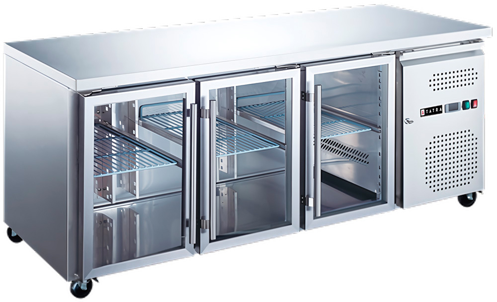 Холодильный стол Tatra TRTGN3 TN G используется на предприятиях общественного питания, торговли и пищевых производствах для охлаждения и кратковременного хранения различных блюд, напитков и продуктов, а также для раскатки теста и обработки ингредиентов. Модель оснащена 3 секциями с самозакрывающимися стеклянными дверьми с магнитным уплотнителем и цифровым термостатом. Материал корпуса и столешницы - нержавеющая сталь, теплоизоляция выполнена из полиуретана.