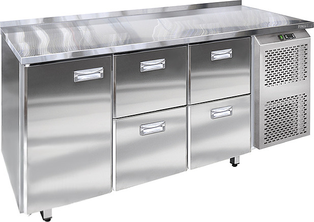 Холодильный стол Finist УХС-600-1/4 используется на предприятиях общественного питания, торговли и пищевых производствах для хранения и обработки полуфабрикатов из мяса и рыбы, заготовок для салата, охлажденных напитков и прочих пищевых продуктов. Управление при помощи кнопочной панели управления, оснащенной цифровым дисплеем. 1 холодильная камера с распашными дверцами, 1 секция с 4 выдвижными ящиками с доводчиками, агрегатный отсек располагается сбоку. Стол установлен на ножки с подпятниками. Материал корпуса - нержавеющая сталь.