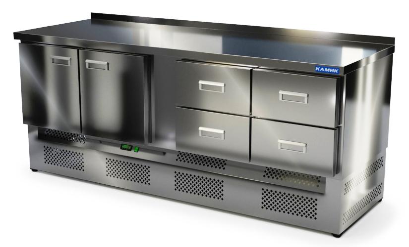 Холодильный стол КАМИК СО-24207Н используется на предприятиях общественного питания и торговли для охлаждения и хранения продуктов, напитков и готовых блюд. Конструкция разделена на секции, каждая из которых оборудована сетчатой полкой и парой направляющих. Корпус выполнен из нержавеющей стали AISI 430 толщиной 1 мм, столешница - из нержавеющей стали AISI 304 толщиной 1,5 мм.