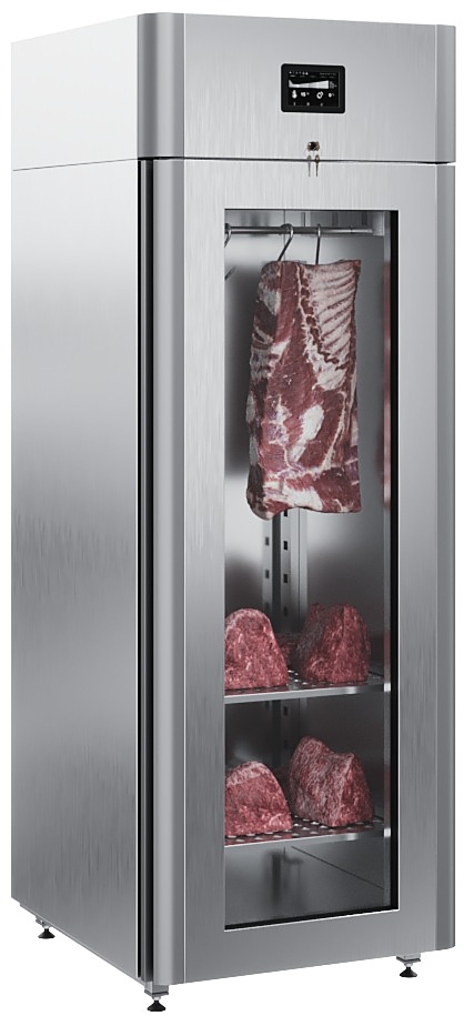 Холодильный шкаф POLAIR CS107 Meat используется на предприятиях общественного питания, торговли и пищевых производствах для приготовления и хранения салями, сыровяленых колбас и прочих мясных деликатесов. шкаф оснащен штангой для подвеса мяса и 2 перфорированными полками, внутренней подсветкой и рассчитан на работу при температуре окружающей среды до 40 °С. Аппарат оснащен встроенным увлажнителем и должен был подключен к системе подачи воды с обязательной водоочисткой и центральной канализации. Материал корпуса - нержавеющая сталь, материал двери - стеклопакет.