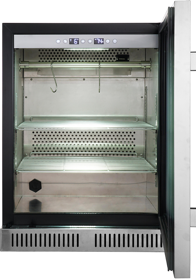 Шкаф для мяса MeatAge LUX SN-125 используется для охлаждения, хранения и вызревания мяса, ветчины и салями на предприятиях общественного питания и торговли, а также в домашних условиях. Управление при помощи Touch Control. Шкаф оснащен акустической сигнализацией. Дверь запирается на ключ. Материал двери - трехслойное анти-УФ стекло светло-коричневого цвета, материал камеры - нержавеющая сталь AISI 304.