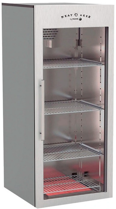 Шкаф Fagor FMA-1650 используется для охлаждения, хранения и вызревания мяса, птицы, колбасы, рыбы, ветчины, сыра и салями на предприятиях общественного питания, торговли, пищевых производствах и в домашних условиях. Модель оснащена электронным управлением, цифровым дисплеем, сигнализацией при изменении температуры, УФ лампой, магнитным уплотнителем, светодиодным освещением, замком двери, съемными решетками, 2 передними регулируемыми ножками и 4 задними роликами. Материал корпуса - высококачественная нержавеющая сталь, материал внутренней отделки - высококачественная нержавеющая сталь AISI 304 толщиной 60 мм, материал двери - двойной стеклопакет.