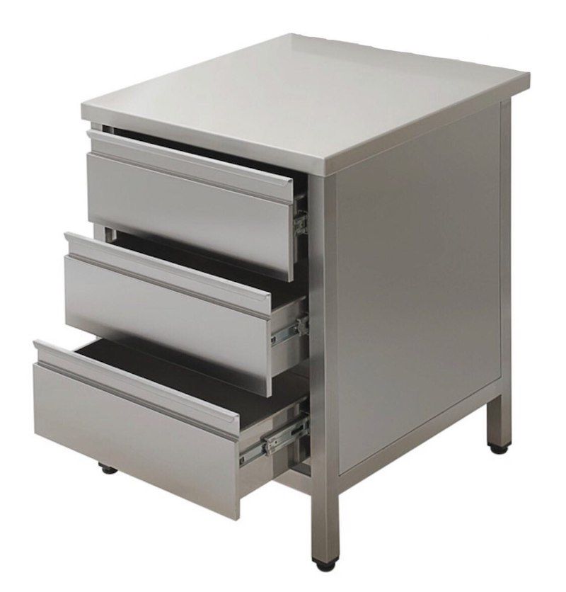 Simeco СЗE0507Я используется на предприятиях общественного питания и торговли для приготовления различных блюд, а так же для хранения посуды, сыпучих продуктов и специй. Модель закрыта с трех сторон. Имеет 3 выдвижных ящика из нержавеющей стали. Каркас стола выполнен из нержавеющей стали AISI 430, столешница - из нержавеющей стали AISI 430. Ножки - труба 40х40 мм.