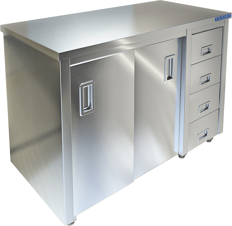 Производственный стол Техно-ТТ СПС-126/1200Н-П предназначен для разделки и обработки пищевых продуктов, а также для расстановки и хранения посуды и кухонного инвентаря на предприятиях общественного питания и торговли. Модель оснащена 4 выдвижными ящиками, расположенными справа, 1 полкой, 2 дверями-купе и регулируемыми по высоте ножками, что позволяет компенсировать неровности пола. Сварной корпус выполнен из нержавеющей стали AISI 304, столешница - из нержавеющей стали AISI 304 и ЛДСП, задняя стенка - из нержавеющей стали AISI 430.