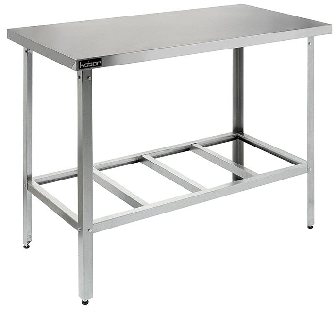 Столешница стола Kобор СР-120/70 произведена из высококачественной нержавеющей стали, а также для увеличения прочности и во избежании прогибания укреплена ламинированной древесно-стружечной плитой толщиной 16 мм. Ножки стола регулируются по высоте, что помогает избежать наклона рабочей поверхности стола. Каркас стола выполнен из оцинкованного уголка. Товар поставляется в разобранном виде и в упаковке для облегчения транспортировки.