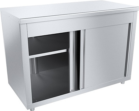 Стол-тумба Пищевые Технологии СТ-К-15/6СНК используется на предприятиях общественного питания, торговли и пищевых производствах для обработки ингредиентов, приготовления различных блюд и хранения кухонного инвентаря. Модель оснащена дверьми-купе, сплошной полкой и регулируемыми ножками. Материал каркаса и столешницы - высококачественная нержавеющая сталь AISI 430 с усиленным листом ЛДСП, материал полки - нержавеющая сталь с усиленным профилем, материал задней стенки - оцинкованная сталь.