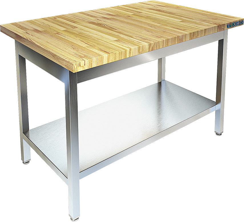 Кондитерский стол Техно-ТТ СП-353/1508 предназначен для раскатки теста и обработки ингредиентов для приготовления кондитерских и хлебобулочных изделий, а также для расстановки и хранения посуды и кухонного инвентаря на предприятиях общественного питания, торговли и пищевых производствах. Модель оснащена регулируемыми по высоте ножками, что позволяет компенсировать неровности пола. Материал разборного каркаса - уголок (40x40 мм) из нержавеющей стали AISI 430, материал сплошной полки-накладки - нержавеющая сталь AISI 430, материал столешницы - бук.