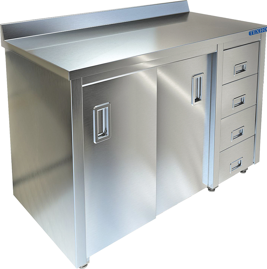 Производственный стол Техно-ТТ СПС-936/1308-П предназначен для разделки и обработки пищевых продуктов, а также для расстановки и хранения посуды и кухонного инвентаря на предприятиях общественного питания, торговли и пищевых производствах. Стол оснащен 4 выдвижными ящиками, 1 сплошной полкой, 2 дверями-купе и регулируемыми по высоте ножками для компенсации неровностей пола. Материал сварного корпуса и столешницы - нержавеющая сталь AISI 430, материал задней стенки - оцинкованная сталь.