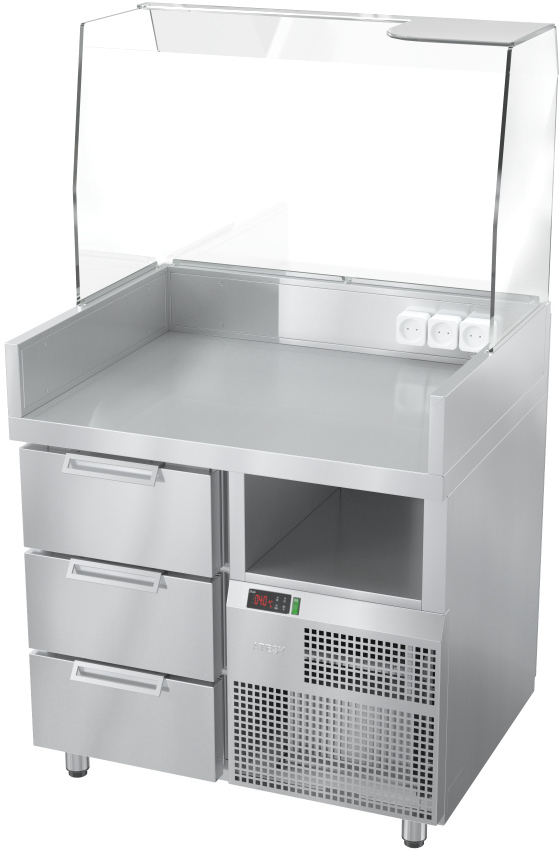 Станция для бургеров и хот-догов ATESY Бавария БХС-900.700-02 плюс используется на предприятиях общественного питания, торговли и пищевых для производствах с целью комплексного оснащения места для приготовления и продажи хот-догов и бургеров, а также хранения охлажденных полуфабрикатов, начинок, соусов и хлебобулочных изделий. Нейтральная ниша для хранения инвентаря и посуды, охлаждаемые гастронормированные ящики (GN 1/1, максимально допустимая глубина устанавливаемых гастроемкостей - 150 мм), температурный режим станции регулируется с помощью встроенного контроллера (есть возможность программирования). Рабочее пространство столешницы предусматривает установку комби-гриля “АРБАТ” КГ-7, гриля контактного “МАЭСТРО” ГК-1, роликового гриля "ГРАТИ-5" (поставляются отдельно). Материал станции - нержавеющая сталь.