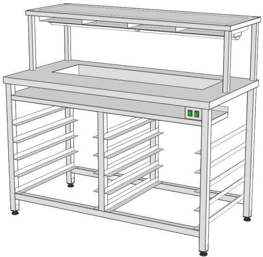 Станция RoboLabs СФ-140Т используется на предприятиях общественного питания, торговли и пищевых для производствах с целью комплексного оснащения места для приготовления и продажи бургеров. Модель оснащена нейтральной ванной на 6 гастроемкостей, тепловой поверхностью, направляющими и подсветкой. Материал станции - высококачественная нержавеющая сталь.