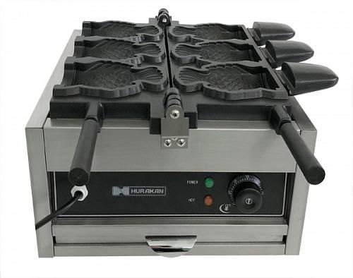 Вафельница Hurakan HKN-TA03 используется на предприятиях общественного питания и торговли для приготовления вафель в форме рыбки-тайяки. Каждая вафля может быть наполнена начинкой. Модель оснащена регулируемым термостатом. Корпус выполнен из нержавеющей стали, рабочая поверхность - из чугуна с антипригарным покрытием.