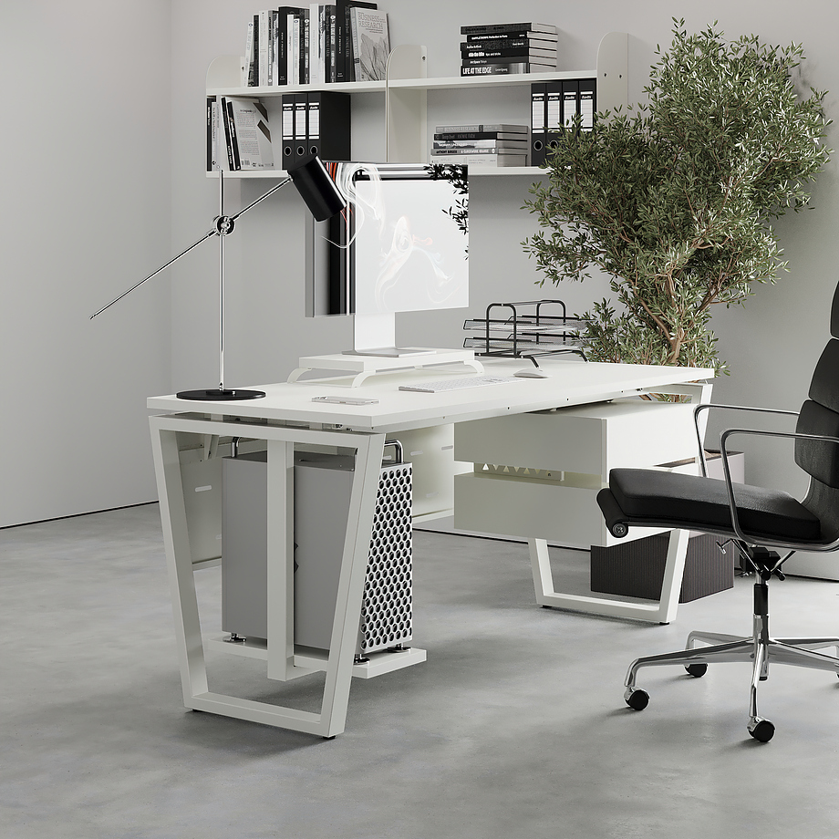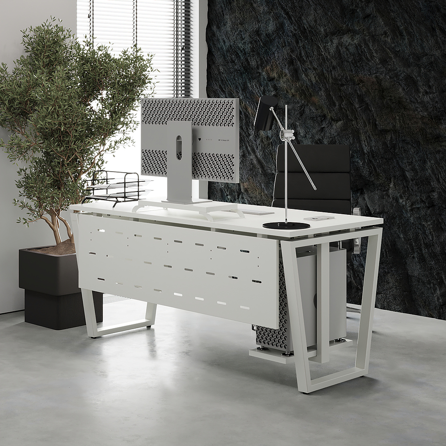 Офисный стол КОБОР OTR-140/70 white/premium используется в офисных помещениях и кабинетах руководителей. Модель оснащена опорами в форме обратной трапеции. Материал столешницы - прочный ЛДСП толщиной 25 мм, усиленная снизу металлическим каркасом, материал опор - окрашенный металл.