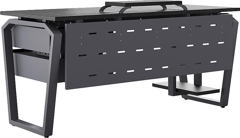 Офисный стол КОБОР TB-140/70 graphite/wood используется в офисных помещениях и кабинетах руководителей. Конструкция модели включает опоры, выполненные в виде перевернутой трапеции со скошенными верхними углами. Материал столешницы - прочный ЛДСП толщиной 25 мм, усиленная снизу металлическим каркасом, материал опор - окрашенный металл.