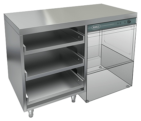 Открытый стол HICOLD НБМКБКП-12/6Л используется на предприятиях общественного питания, торговли, в гостиничном бизнесе и других сферах для комплектации барных стоек и размещения посудомоечной машины. Стол оснащен специальным крылом, под которое встраивается посудомоечная машина и 3 полками для корзин с бокалами. Материал корпуса - нержавеющая сталь AISI 430, столешница усилена листом ДСП.