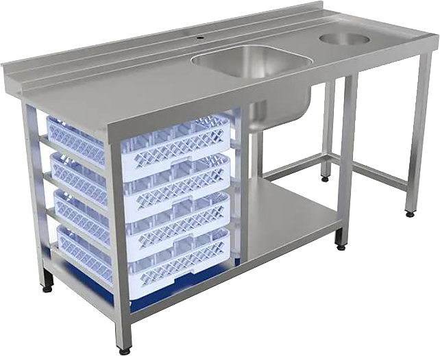 Входной стол Кобор СПМ/2-170/70/П используется на предприятиях общественного питания, торговли, в гостиничном бизнесе и других сферах для комплектации барных стоек и размещения посудомоечной машины. Стол оснащен отверстием под смеситель, отверстием для сбора отходов, 4 уровнями направляющих для посудомоечных кассет, полкой и бортом. Материал каркаса - труба из нержавеющей стали (40x40 мм), материал столешницы - нержавеющая сталь AISI 430.