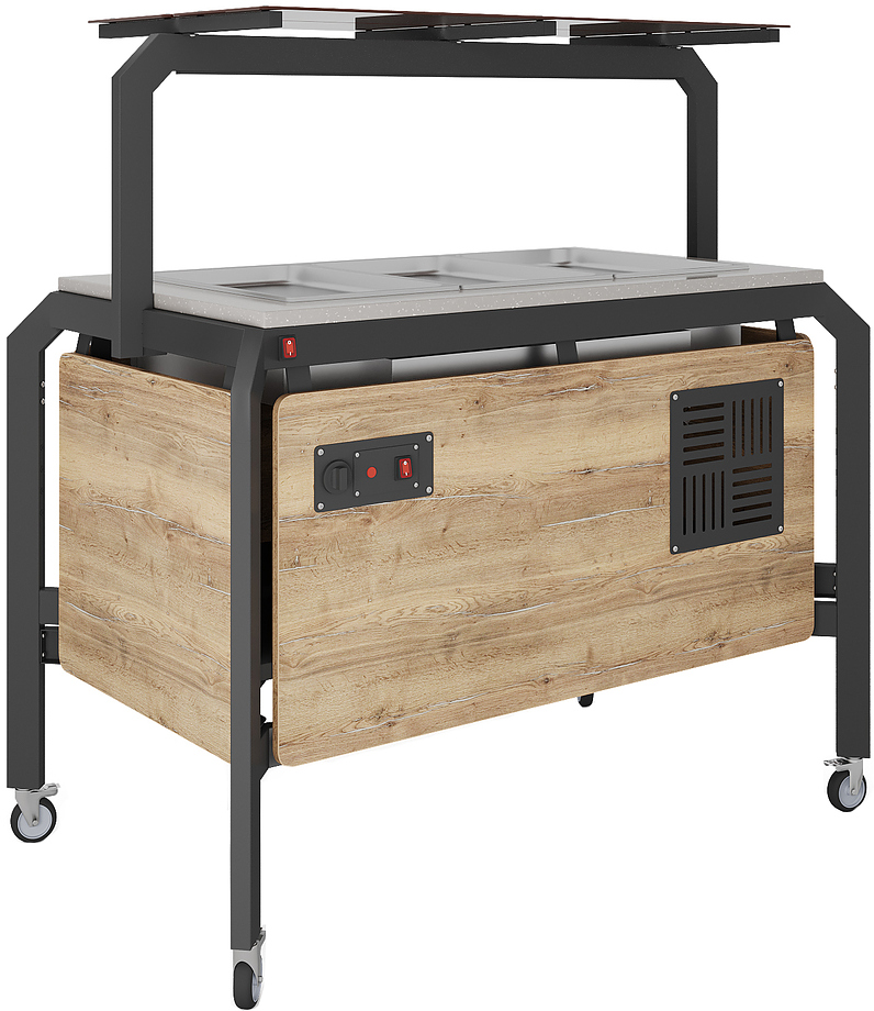 Мармит Кобор AN120 используется для демонстрационной подачи, кратковременного хранения и поддержания в горячем состоянии гарниров в составе линий раздачи на предприятиях общественного питания, торговли и пищевых производствах. Модель оснащена механическим терморегулятором, открытой полкой, полкой надстройкой со стеклом, и колесами, 2 из которых с тормозами. Материал сварного каркаса - окрашенная сталь (профиль с сечением 60х30 мм), материал внешнего корпуса - ЛДСП, материал столешницы - искусственный камень.