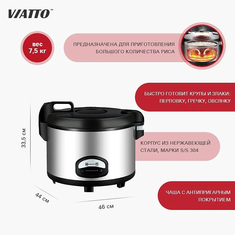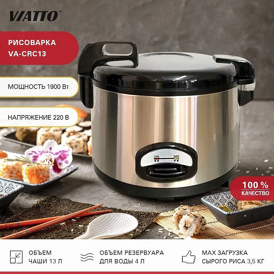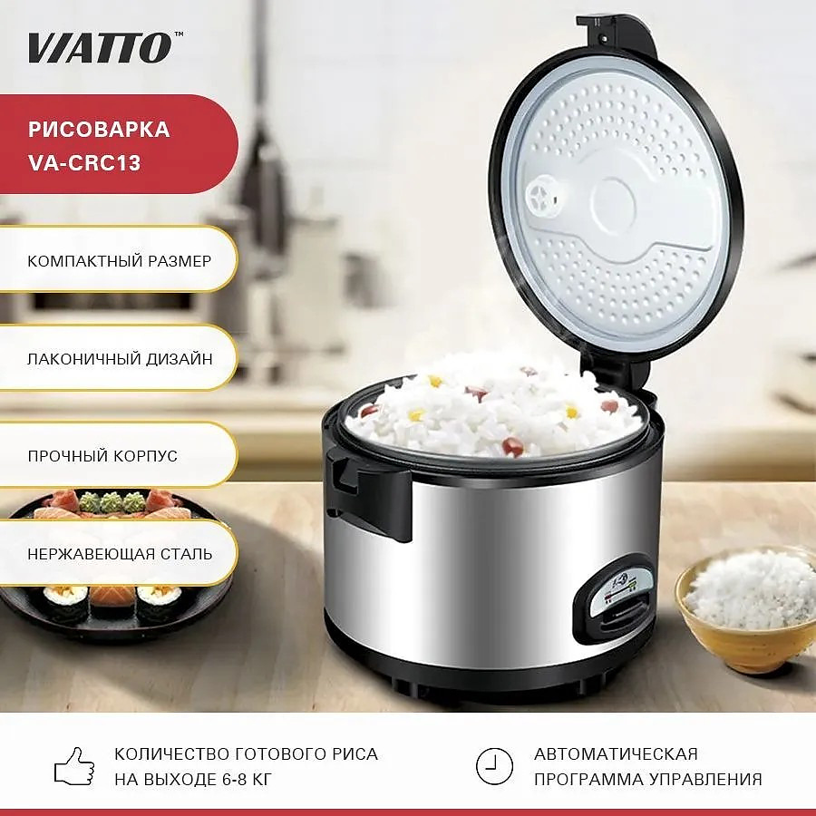 Рисоварка VIATTO VA-CRC13 предназначается для варки и поддержания температурного режим риса и прочих круп на предприятиях общественного питания, торговли и пищевых производствах. Автоматический переход в режим поддержания риса в разогретом состоянии по окончании готовки. Равномерный нагрев позволяет приготовить большое количество риса, не повреждая его структуру. Материал корпуса - нержавеющая сталь, материал чаши - алюминиевый сплав с антипригарным покрытием, материал ручек - безопасный термоизоляционный материал.